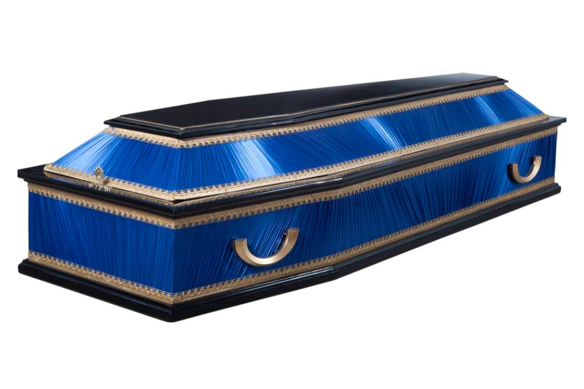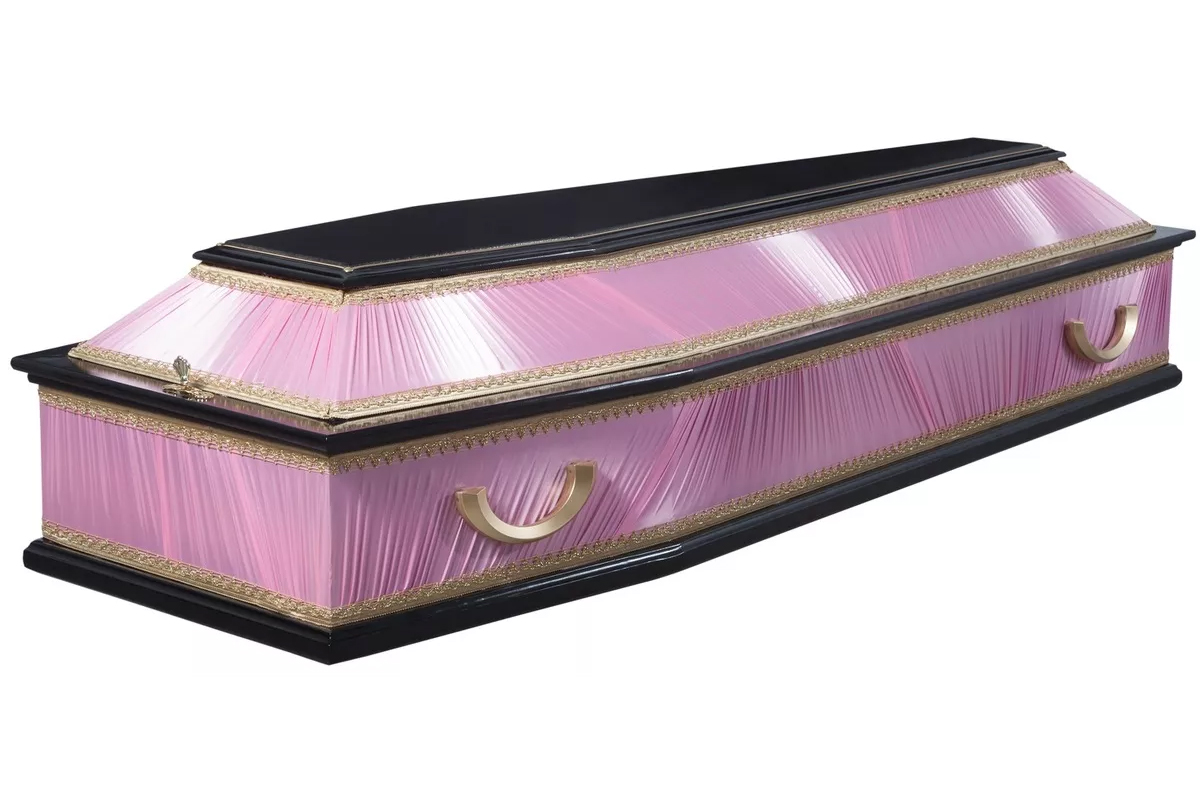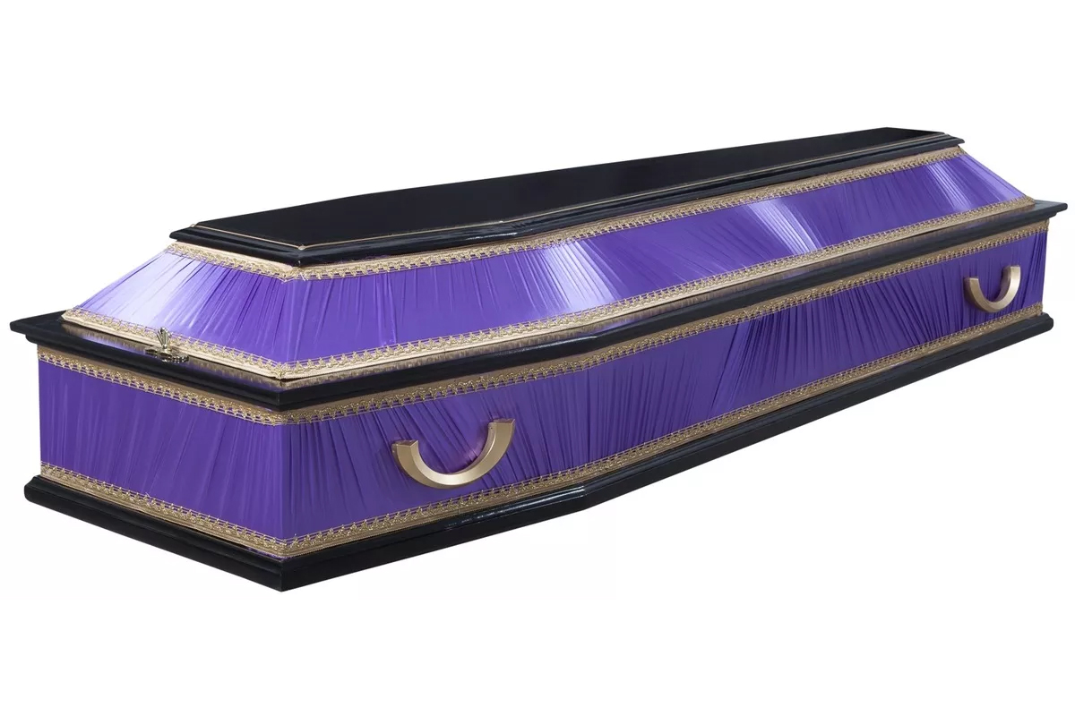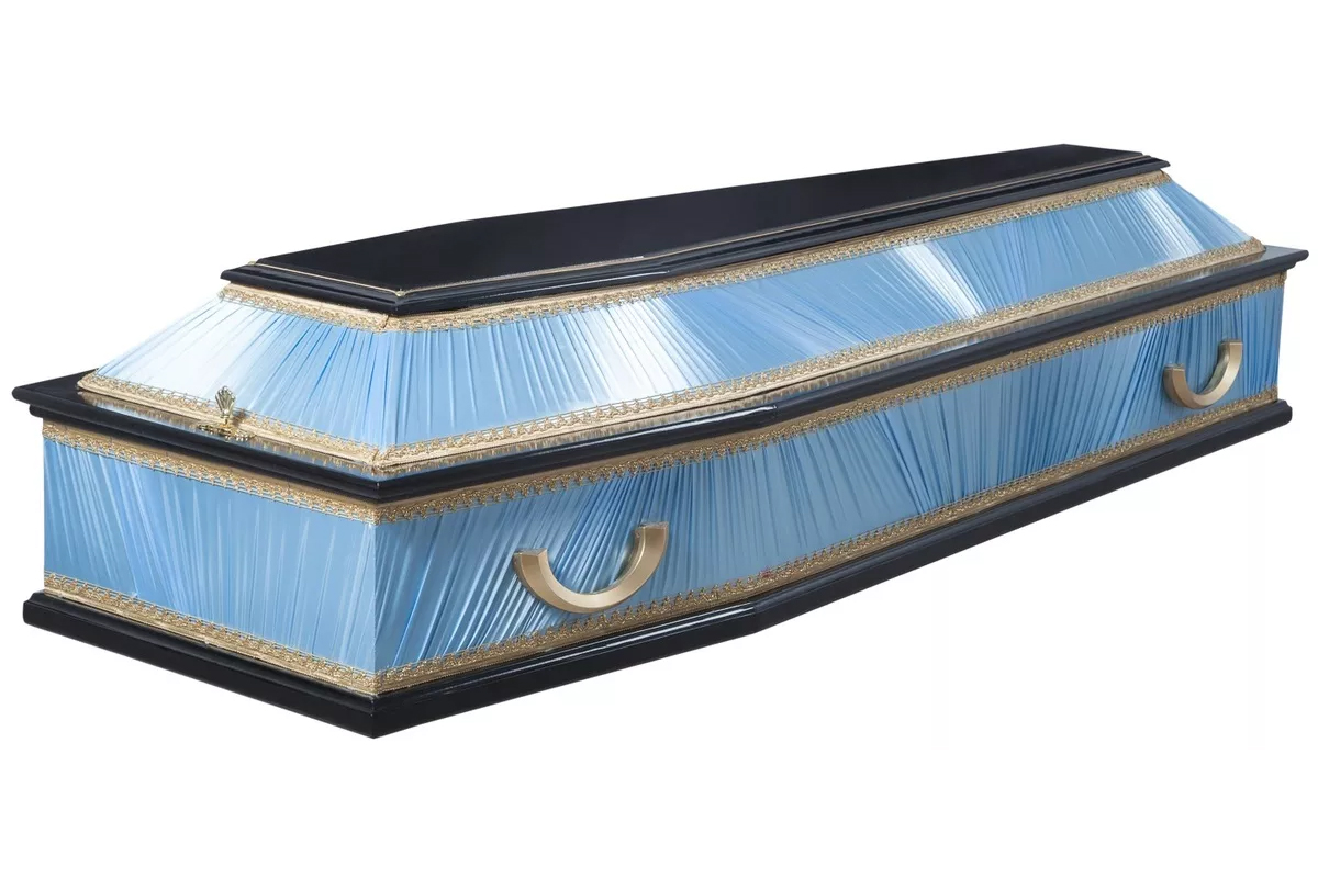 Имеет традиционную шестигранную форму. Крышка съемная. Гроб обит тканью и комплектуется прочными ручками (4шт), установленными по бокам гроба.