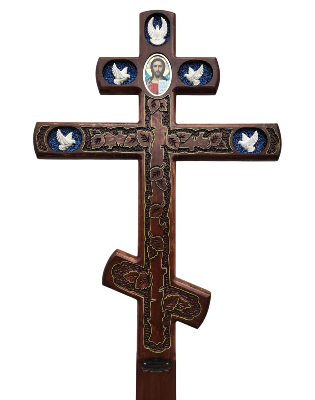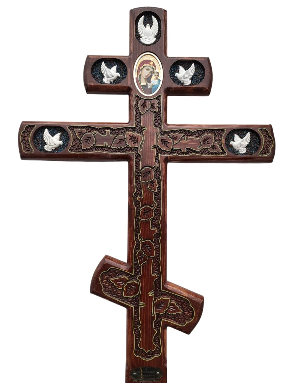 Большой, красивый и элегантный православный крест из сосны. Украшен иконой Иисуса или Богородицы и нанесено изображение голубей. Крест имеет прямую форму и является классическим символом на могиле. Его легко устанавливать на могилу, а качественное исполнение позволяет оставить его на долгое время.