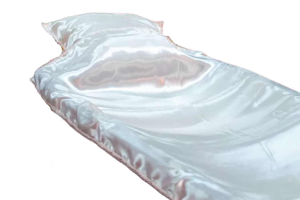 Комплект для погребения атласный с узким серебряным кружевом белого цвета. В комплект входит наволочка и покрывало.