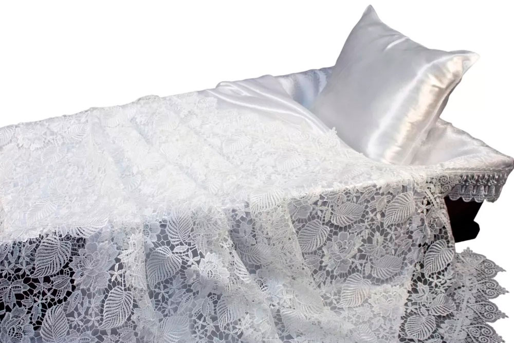 Ритуальный набор текстиля «Ажур» для погребения белого цвета. В комплект входит наволочка и покрывало.