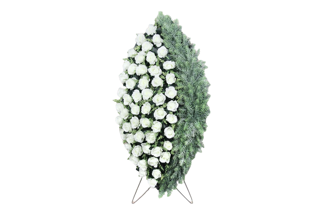 Траурный венок из искусственных цветов. Он символизирует уважение и память, идеально подходит для использования на похоронах и в траурных церемониях.