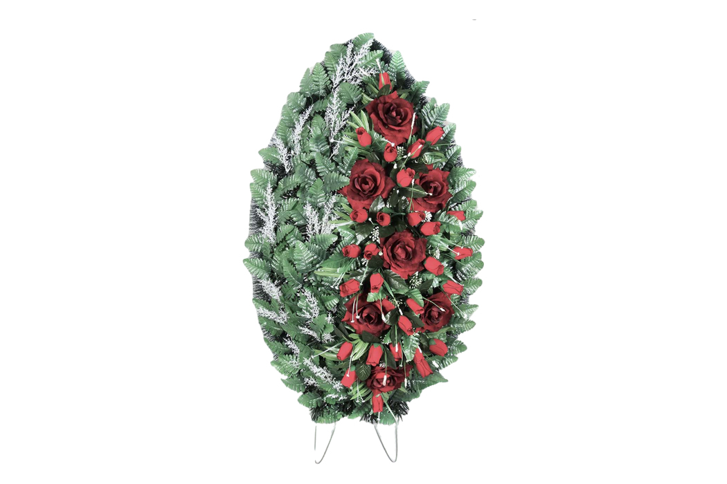 Венок из искусственных цветов «Красные ели» 125см можно заказать по телефону или при личном обращении в офис службы. Большой выбор ритуальных товаров в Интернет-магазине ООО «ГУП ЕС ГРС».