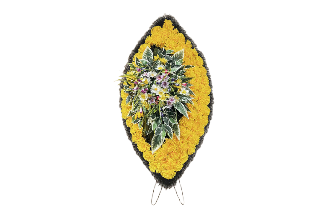 Траурный венок из искусственных цветов. Он символизирует уважение и память, идеально подходит для использования на похоронах и в траурных церемониях.