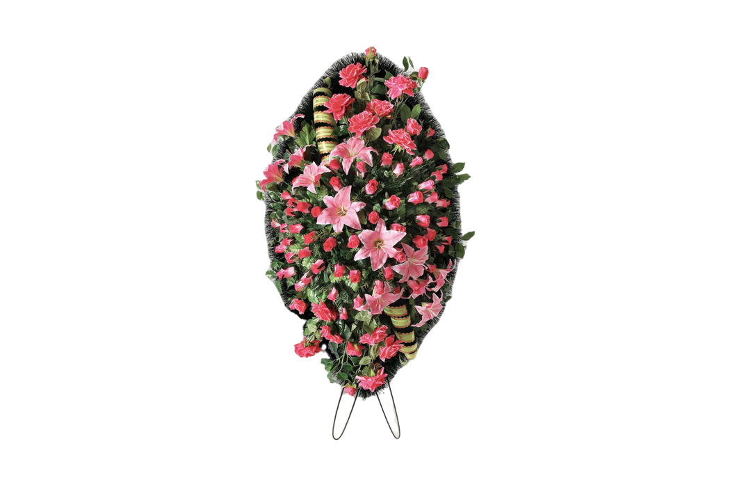 Траурный венок из искусственных цветов. Он символизирует уважение и память, идеально подходит для использования на похоронах и в траурных церемониях.