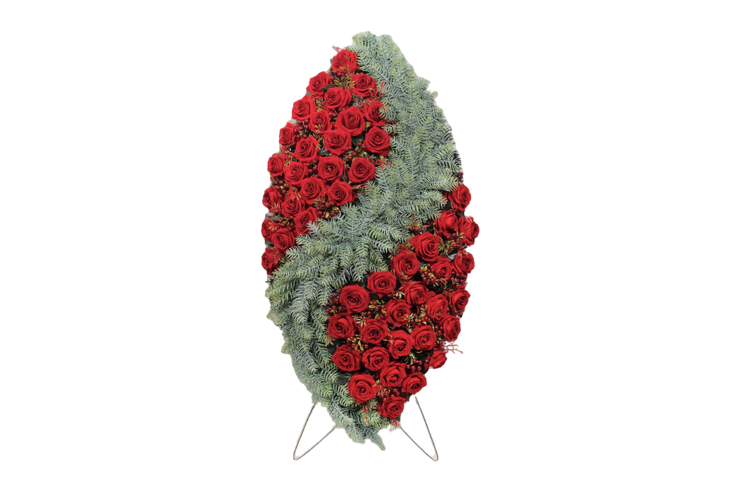 Траурный венок из искусственных цветов. Он символизирует уважение и память, идеально подходит для использования на похоронах и в траурных церемониях.