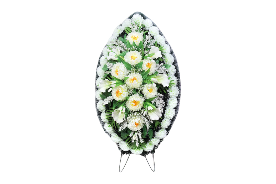 Траурный венок из искусственных цветов. Он символизирует уважение и память, идеально подходит для использования на похоронах и в траурных церемониях.