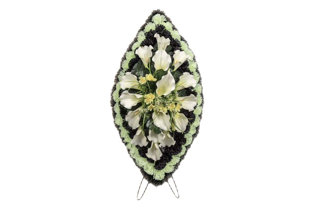 Траурный венок из искусственных цветов. Он символизирует уважение и память, идеально подходит для использования на похоронах и в траурных церемониях.