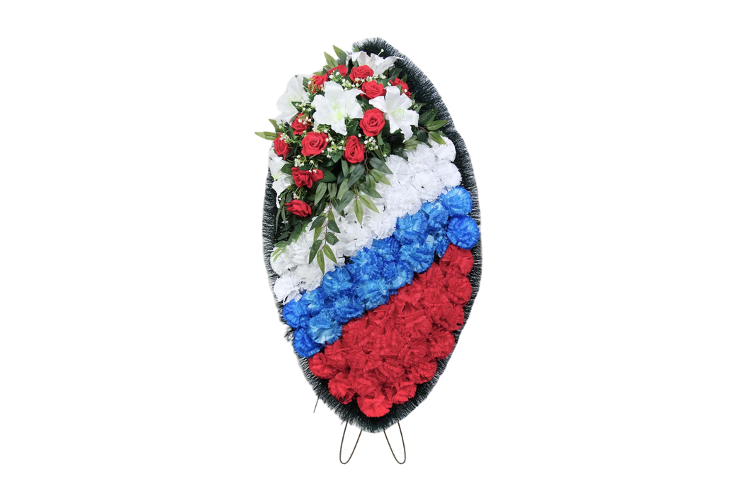Траурный венок из искусственных цветов. Он символизирует уважение и память, идеально подходит для использования на похоронах и в траурных церемониях.