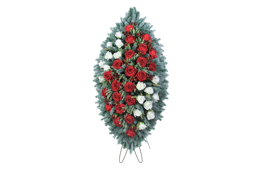 Траурный венок из искусственных цветов. Он символизирует уважение и память, идеально подходит для использования на похоронах и в траурных церемониях.