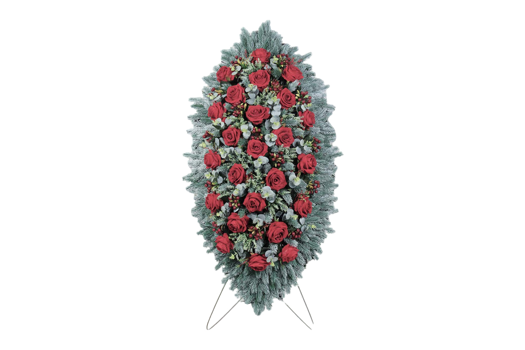 Траурный венок из искусственных цветов. Он символизирует уважение и память, идеально подходит для использования на похоронах и в траурных церемониях.