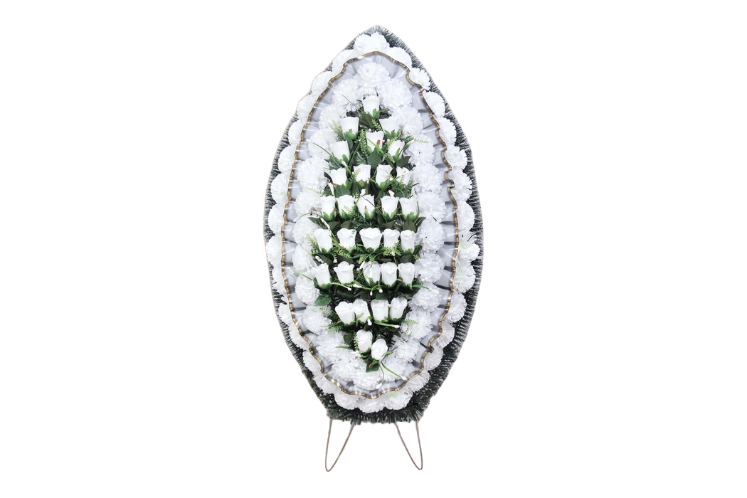 Траурный венок из искусственных цветов. Он символизирует уважение и память, идеально подходит для использования на похоронах и в траурных церемониях.