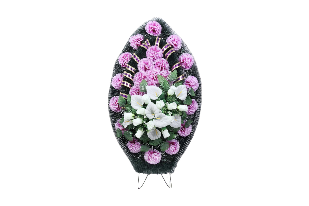 Траурный венок из искусственных цветов. Он символизирует уважение и память, идеально подходит для использования на похоронах и в траурных церемониях.