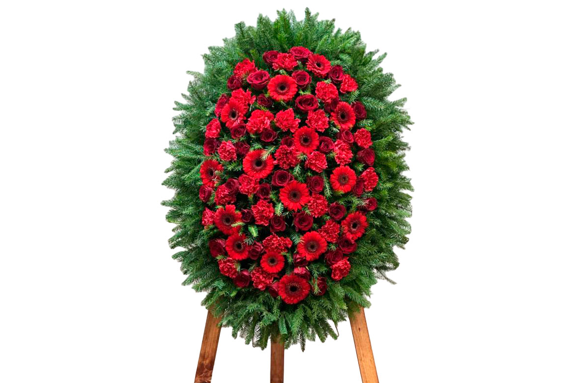 Траурный венок из живых цветов. Он символизирует уважение и память, идеально подходит для использования на похоронах и в траурных церемониях.